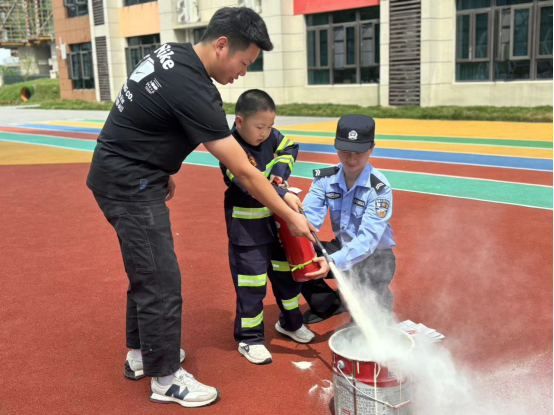 演练结束后,民警和志愿者们一起指导小朋友如何使用灭火器。