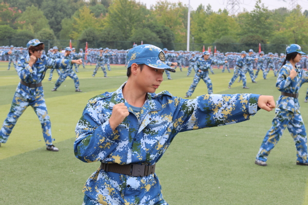 随后的军训成果汇报环节将现场气氛推向高潮。军体拳方阵动作精准,气势如虹;49个受阅方阵身着戎装,迈着铿锵有力的步伐依次通过主席台,口号声响彻云霄。集体合唱《歌唱祖国》深情献礼国庆,展现了新一代学子的昂扬斗志。