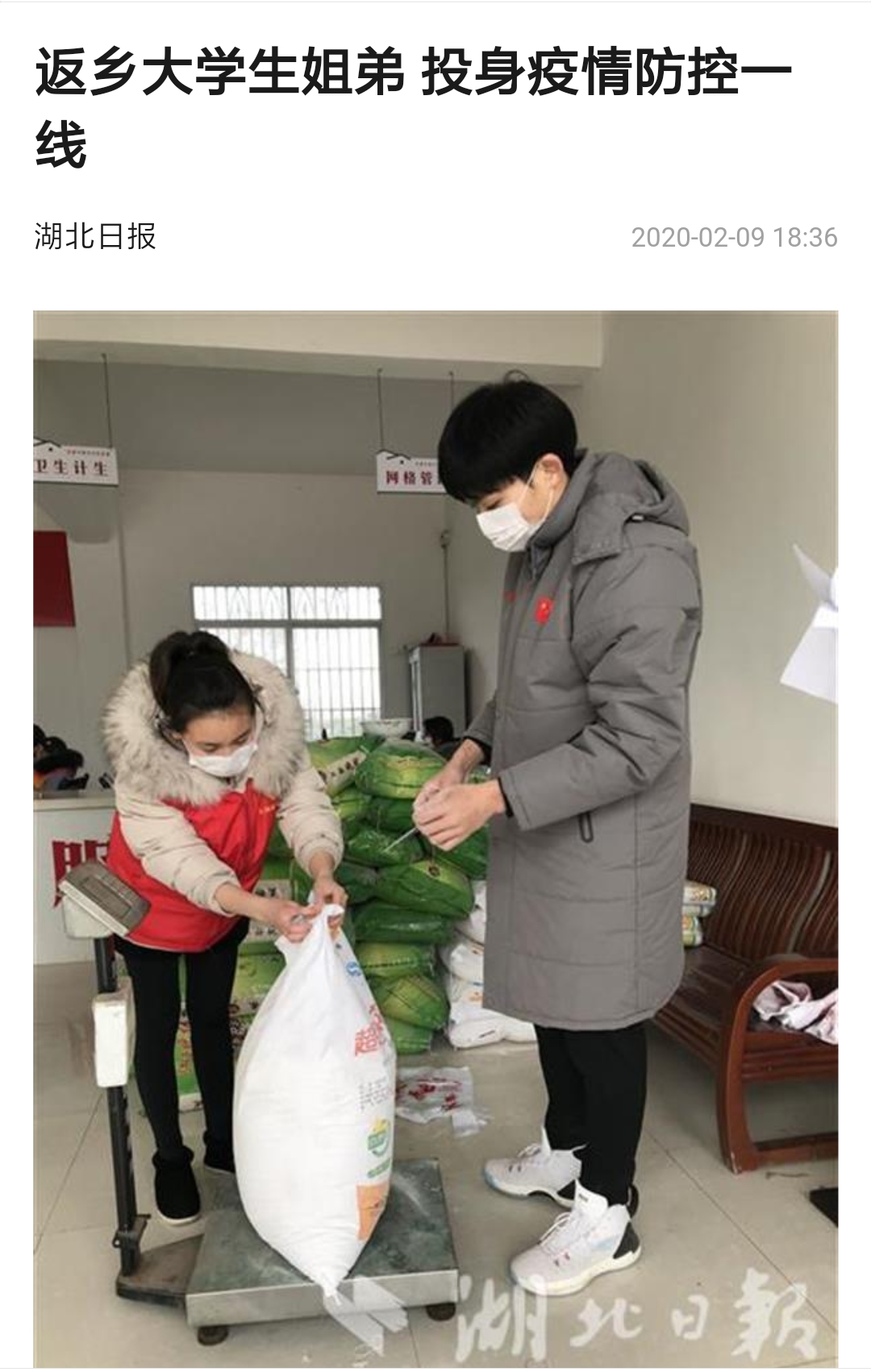 2020年2月9日,湖北日报上有一篇关于疫情防控的新闻引起广泛关注,主人翁正是开云app最新版下载理工学部数学与应用数学专业1603班的吕奎同学和其弟弟吕东阳。据报道,2020年2月7日,姐弟俩从村微信群里看到“志愿者征集令”后,2月8日一大早便到三州村委会报到,参与对村民生活必需品的分装与发放。图片中是2月8日当天,他们在枝江市百里洲镇三洲村防疫物资分配现场填写订购物资的订购居民的姓名并给居民分配物资时的情景。姐弟俩一个牵着口袋,一个则对袋中面粉进行分装。分装完面粉后,又开始为居家隔离的村民分装集中采购的大米、面条和新鲜的蔬菜并贴上标签,以备村组干部精准送达村民家中。
