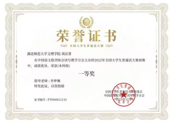 本次大赛自20229月启动,分为研究生组、本科生组、专科生组三个组,每组分开评奖。初赛题型分为单音节字词、多音节词语、语序判断题、短文朗读,全程采用线上方式进行,由组委会专家评委进行分组评审。刘京菁同学经过层层角逐,最终荣获了本科组全国一等奖的荣誉。