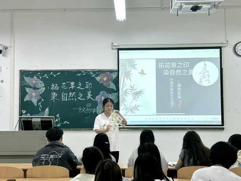 20241114日晚,中文2403班在1A106教室举办了一场别开生面的植物拓染活动,主题为“拓花草之印,染自然之美”。此次活动不仅让同学们亲手体验并传承这一传统染色技艺,也展示了植物拓染艺术的独特魅力。