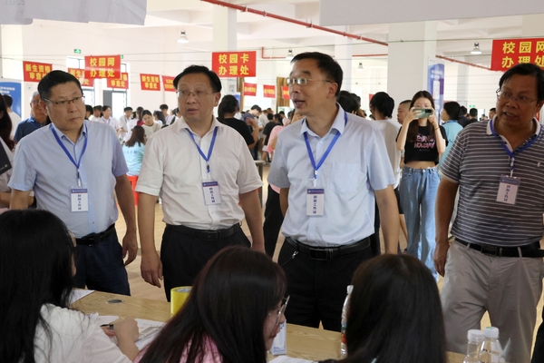 9月8日,湖北师范大学党委书记李宏,校长雷儒金,纪委书记陆咏梅,党委常委肖六亿,以及相关部门负责人来开云(中国)检查指导迎新工作,实地查看了各迎新点和新生宿舍,开云(中国)全体院领导以及相关部门负责人全程陪同。