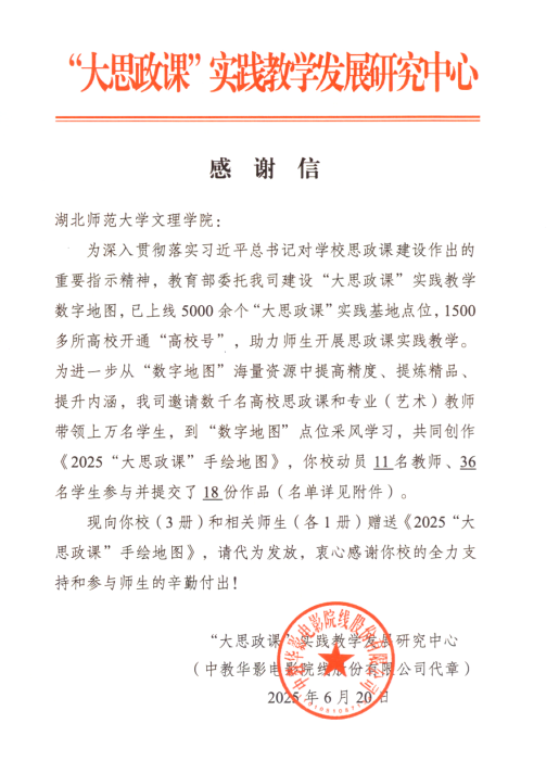 近日,“大思政课”实践教学发展研究中心与中教华影电影院线股份有限公司联合向开云app最新版下载发来感谢信,对学校积极参与《2025“大思政课”手绘地图》创作工作、助力“大思政课” 实践教学发展给予高度认可与诚挚感谢。